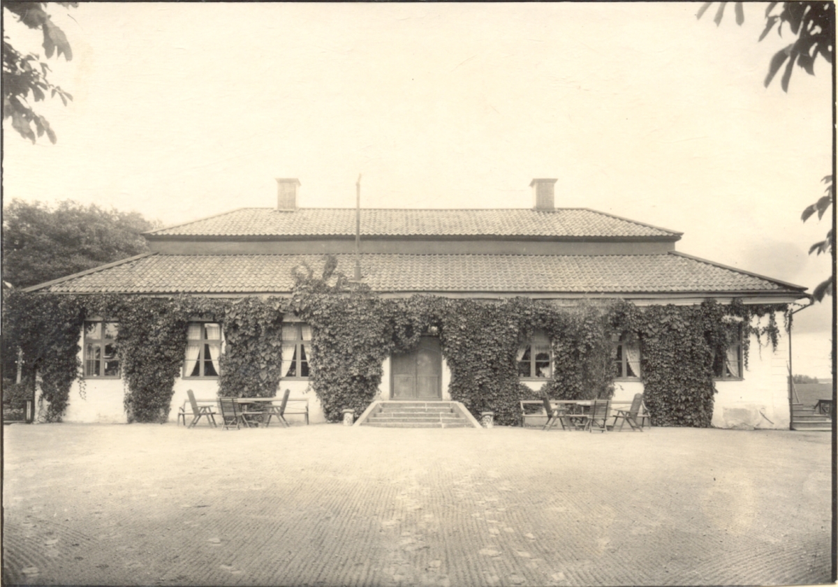 Toverums säteri. Huvudbyggnaden från gården. Putsreveterat timmerhus från 1700-talets förra del. Vitt. Takets vertikala mellanled täckt med plåt. Plan med förstuga och stor utbyggd sal i mitten.