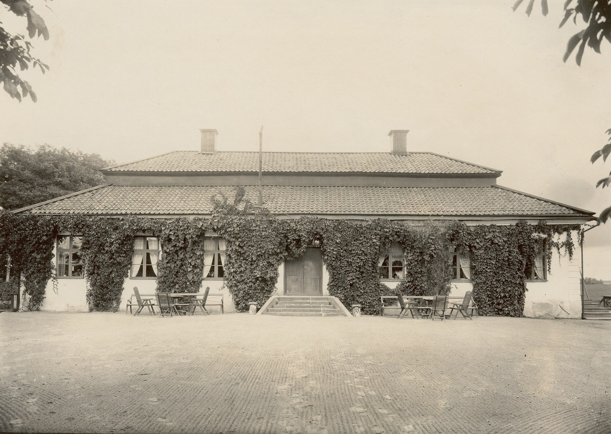 Toverums säteri. Huvudbyggnaden från gården. Vitt putsreveterat timmerhus från 1700-talets förra del. Taket har vertikala mellanled täckt med plåt. Plan med förstuga och stor utbyggd sal i mitten.