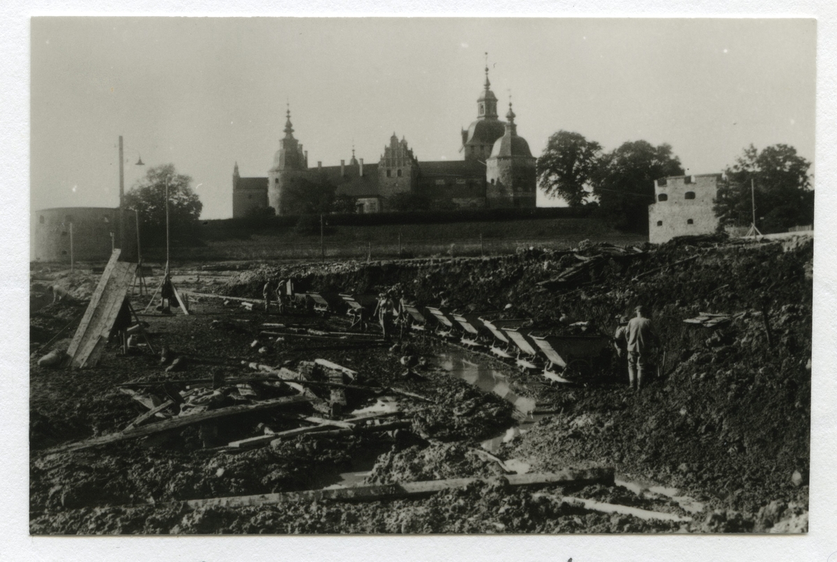 Utgrävningen av Slottsfjärden 1933-34. De massor som grävdes upp användes för att fylla ut Finngrundet och Tjärhovet. Massorna forslades i vagnar på en tillfällig järnväg. Vagnarna drogs av ett ånglok kallat "Pysen". Bilden visar Pysen och tippvagnarna just innanför dammvallen.