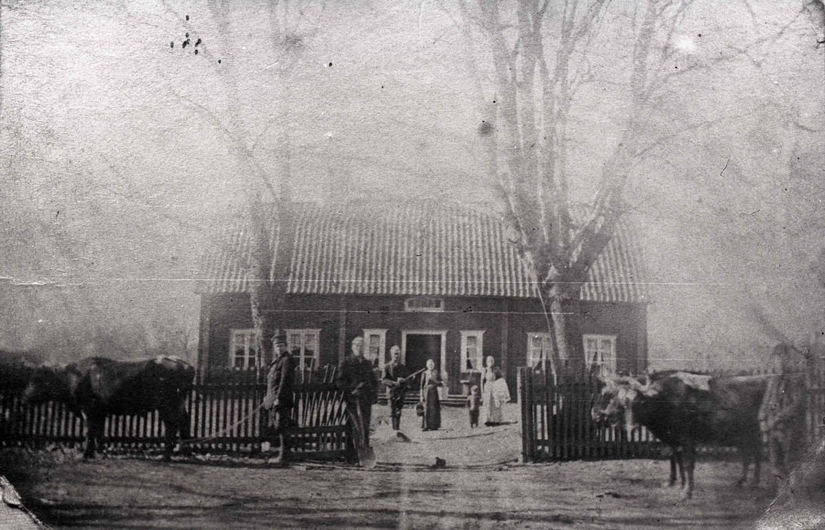 Familj med djur framför mangårdsbyggnad i Gårdveda.