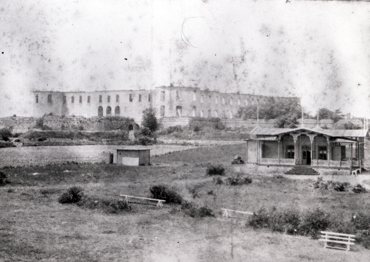 Serveringspaviljongen Höjden, till höger, framför Borgholms slottsruin.