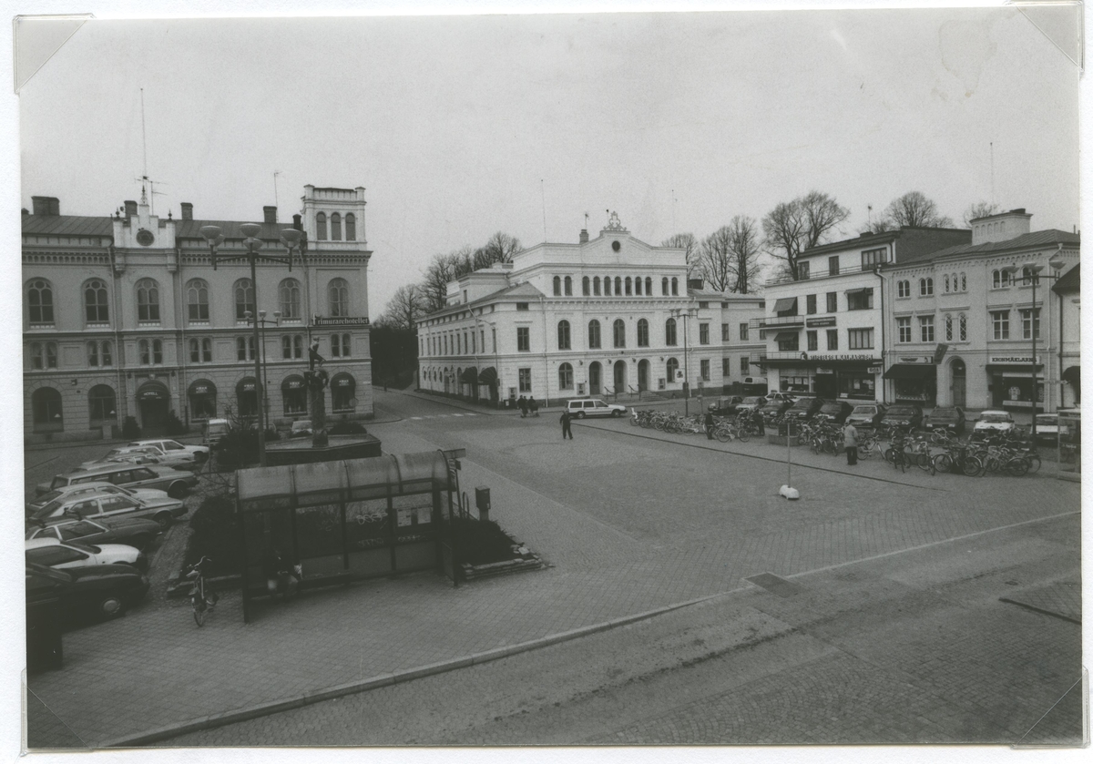 Frimurarhotellet och teatern på Larmtorget. När bilden togs användes torget som parkeringsyta.