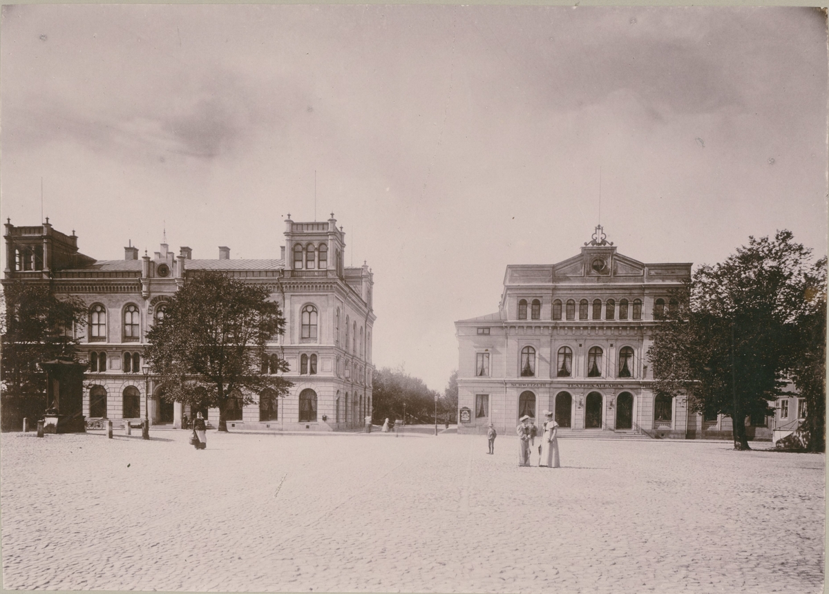 Larmtorget på Kvarnholmen i Kalmar med Frimurarehotellet och Kalmar teater. Den kommunala dricksvattenbrunnen finns kvar.