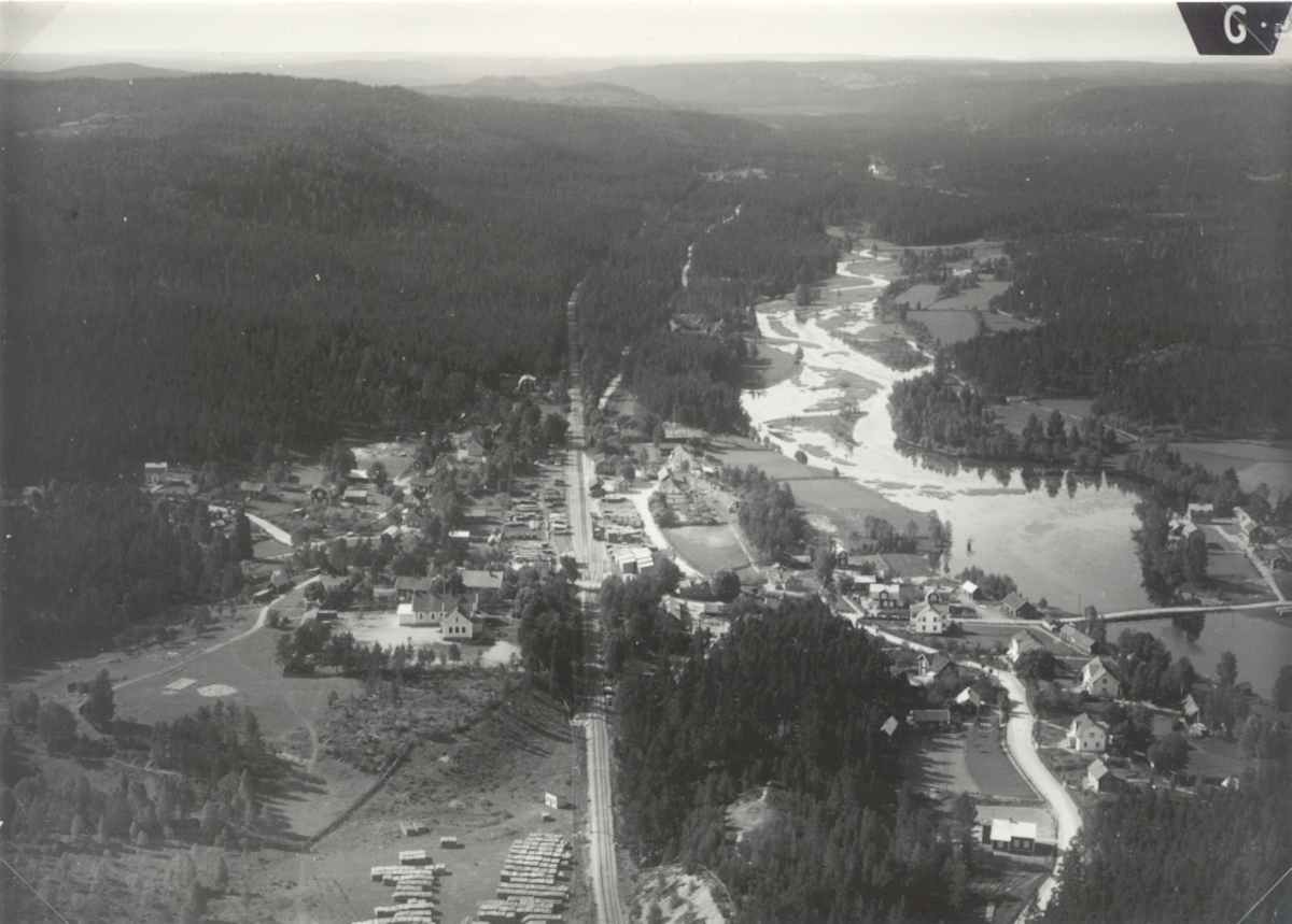 Flygfoto över Lönneberga stationssamhälle. Till vänster skolhuset i Björnhorva, till höger bron över Silverån vid Dal.