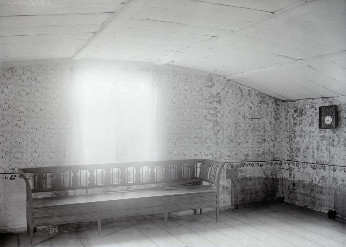 Manbyggningen på Nyebo. Övre bottnens stora gavelrum. Välvt tak. Gul kakelugn, (se foto B209). Schablonmålning på papper: blågrå botten, ramverket kring rutorna av blågrå tvärlinjer, blommorna i rutorna vita och gröna. Avgränsning mot panelen en svart list, målad, med bladornament under i svart. Panelen i övrigt vit.