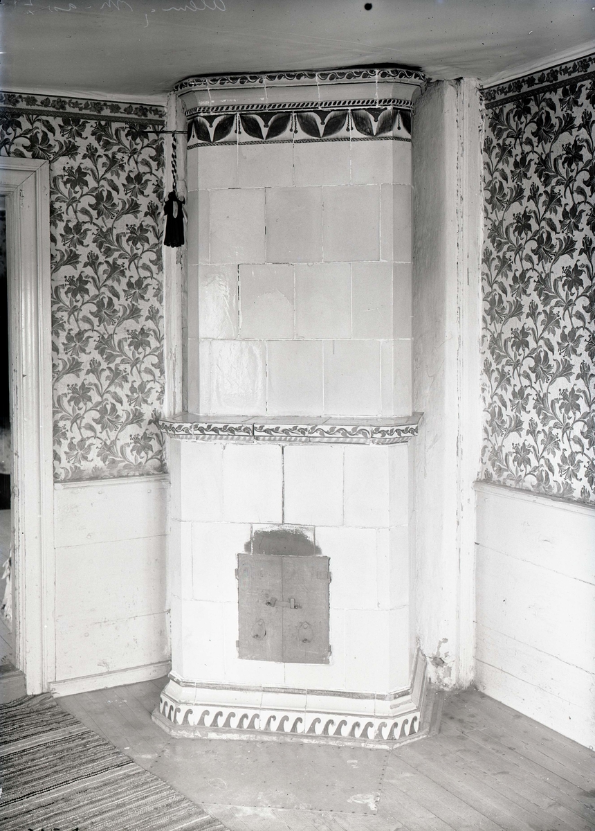 Kakelugn, på övervåningen, som har gulgrönt kakel och dekor i rött och grönt.