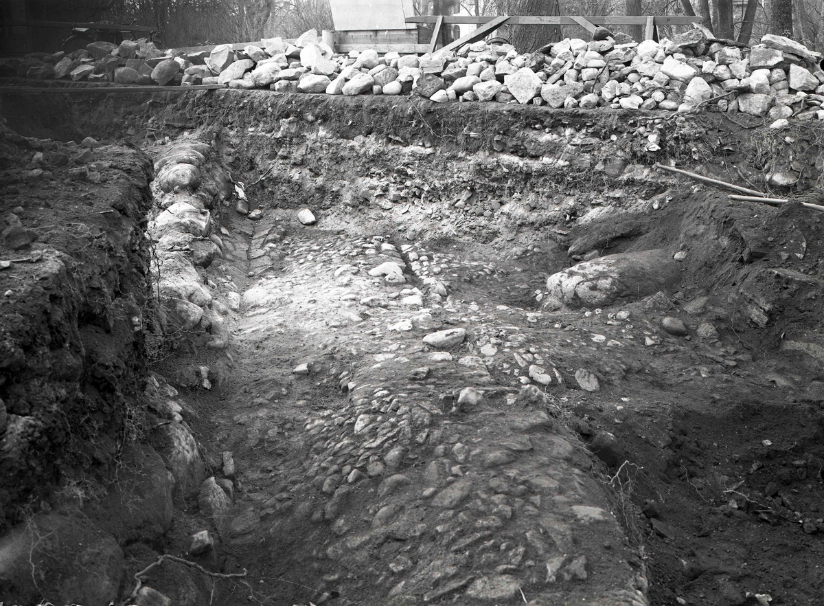 Grävning på platsen för nya restaurangbyggnaden i Stadsparken.Husgrund och kullerstensgata i den västra delen av området.