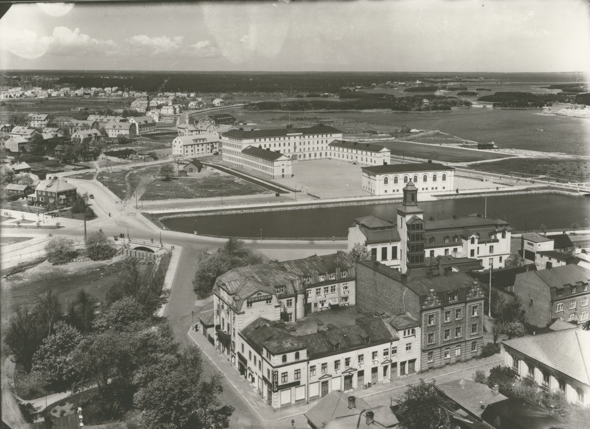 Flygbild som visar brandstationen och Stagneliusskolan som är i mitten av bilden.