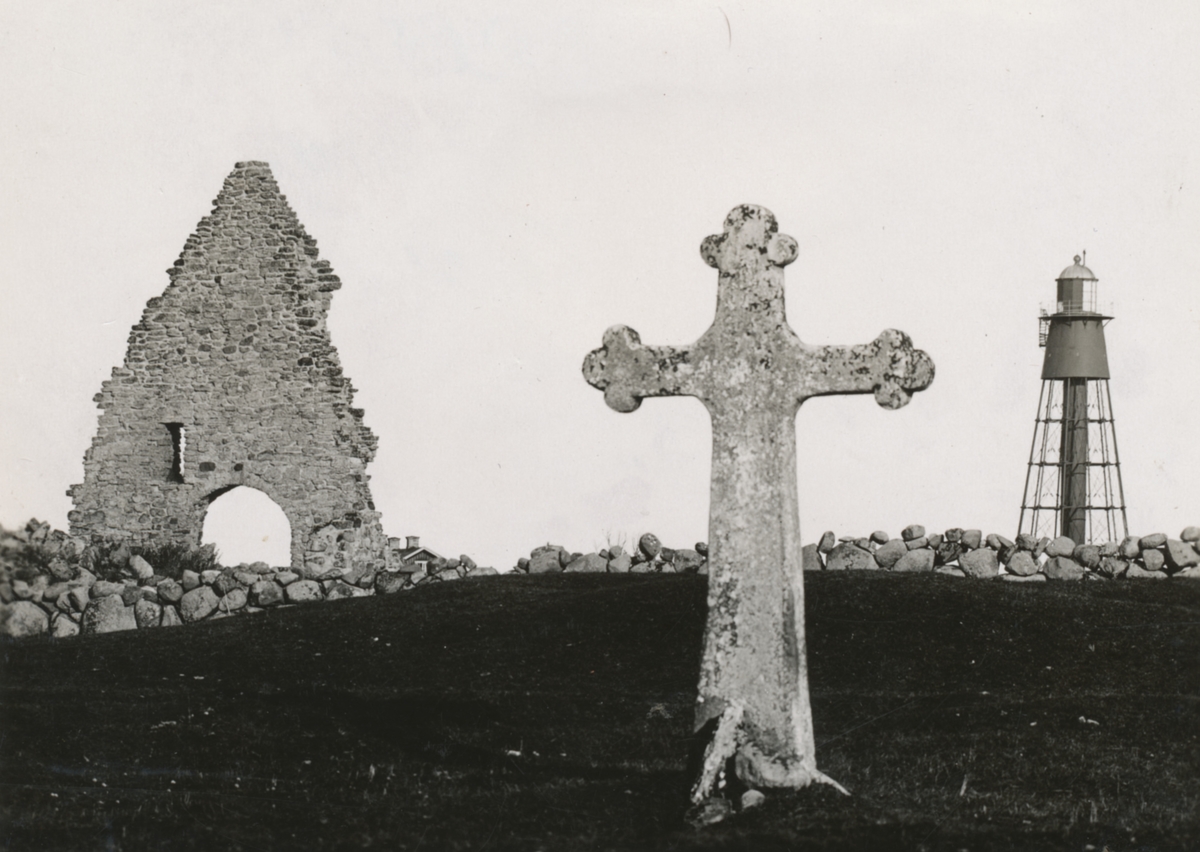 Stenkorset samt kapellruinens, (Sankta Britas kapell), östra gavel före restaureringen 1928-1929.