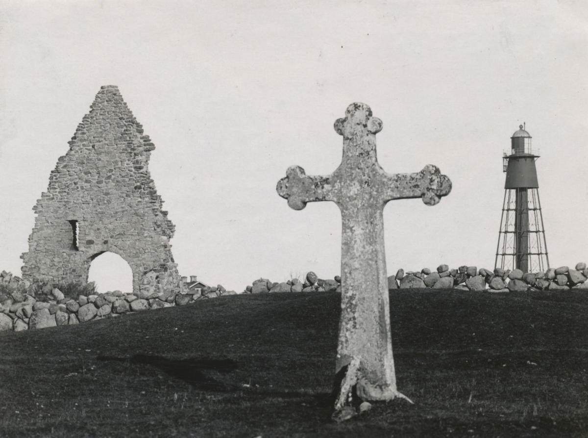 Kapellruinen (Sankta Britas kapell), manolitkorset och fyren, (en så kallad Heidenstammare), på Kapelludden.