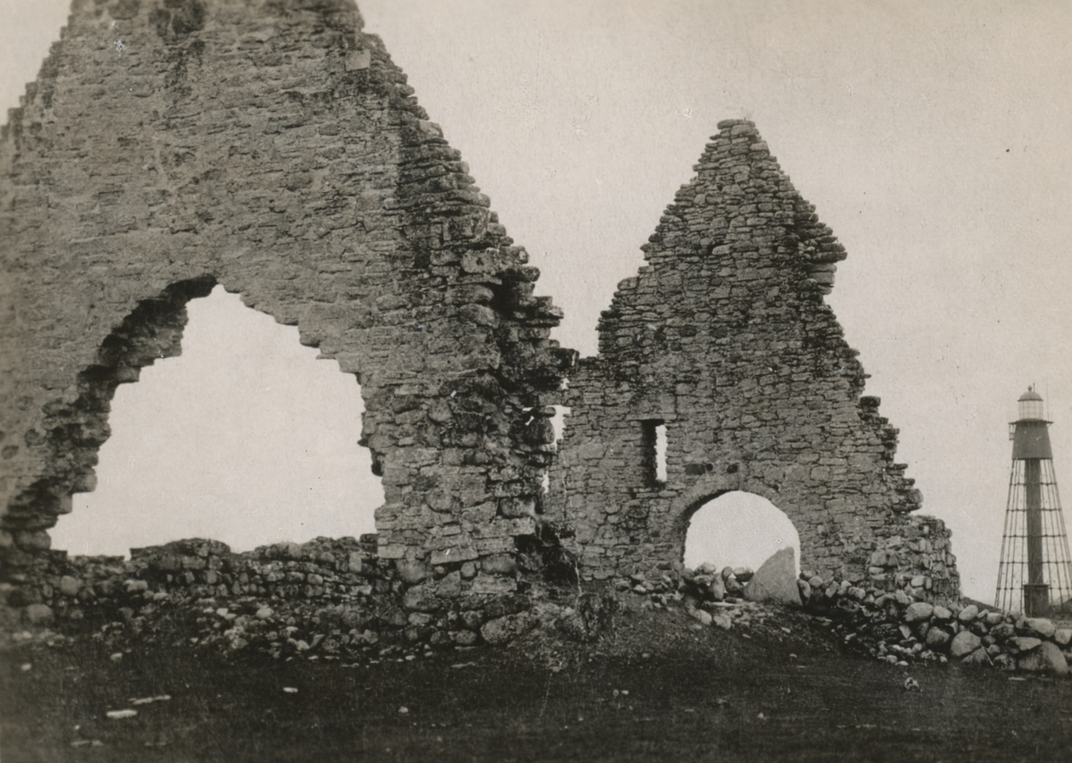 Kapelludden, med ruinen av Sankta Britas kapell, före stormen 1914, som raserade den västra gaveln.