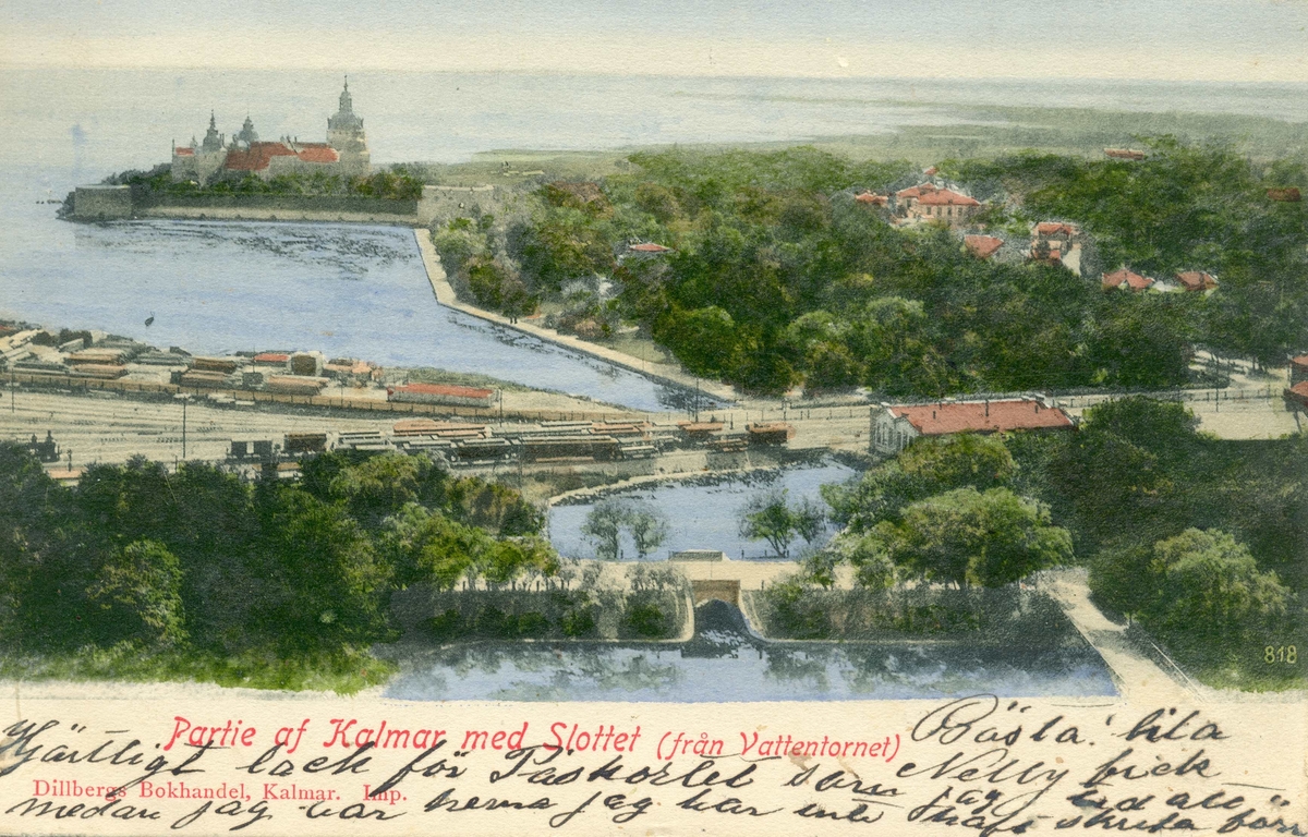 Kolorerat vykort, föreställande parti av Kalmar, med slottet, sett från vattentornet.