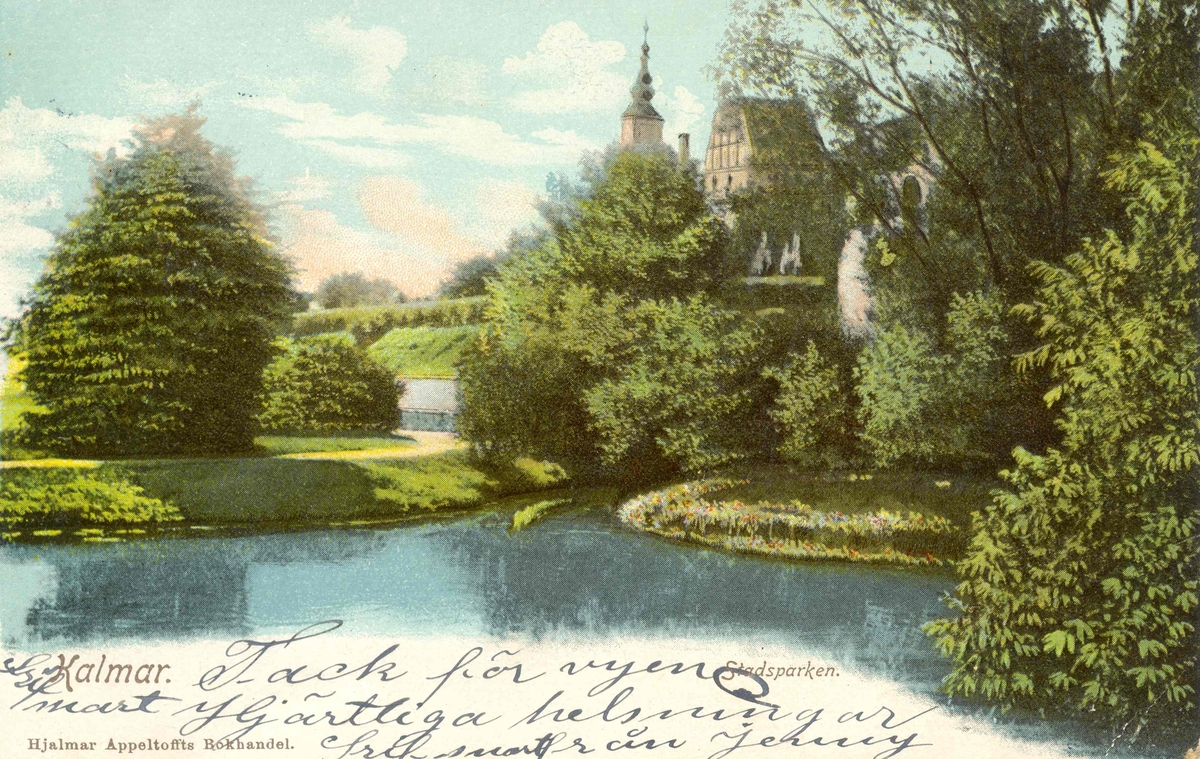 Brevkort, efter målad förlaga, föreställande Stadsparken i Kalmar, med slottet skymtande i bakgrunden.