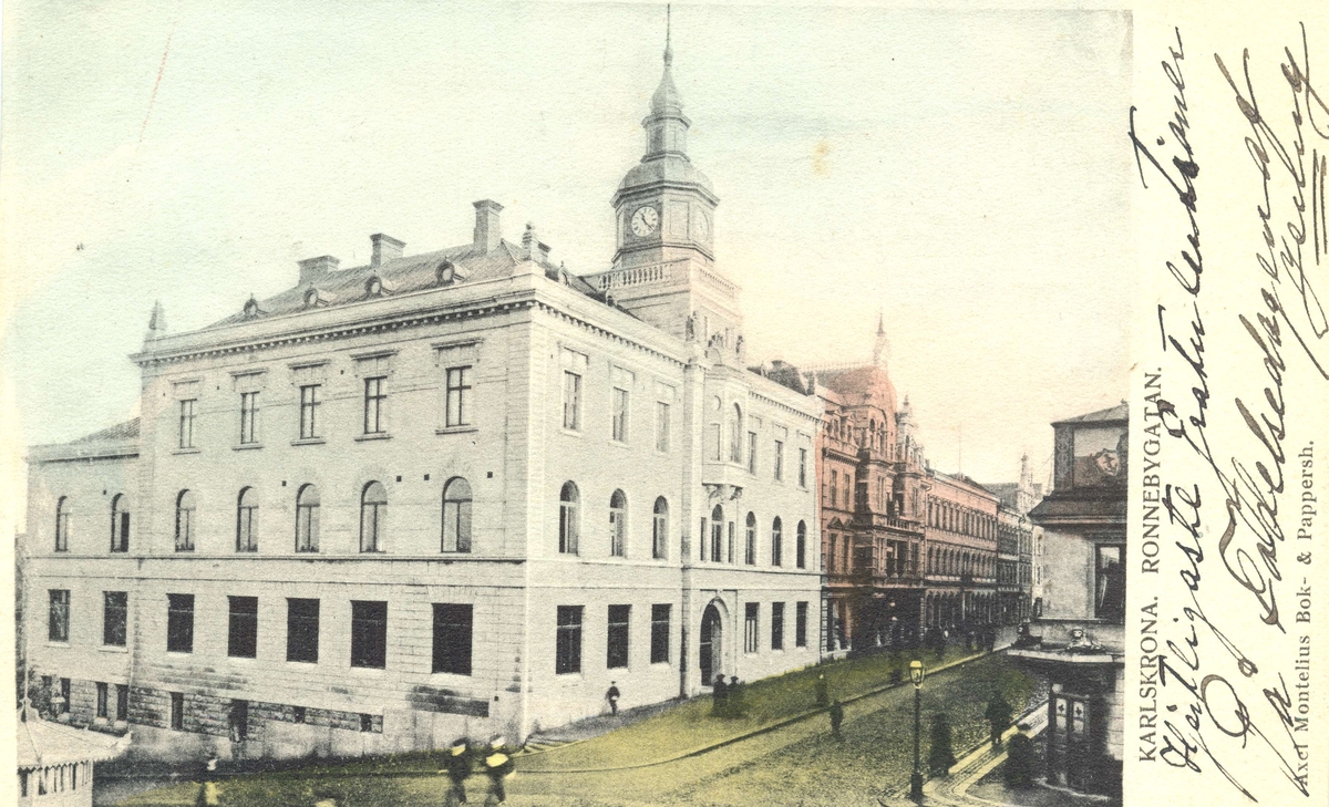 Delvis kolorerat vykort, föreställande Ronnebygatan i Karlskrona, omkring 1905.