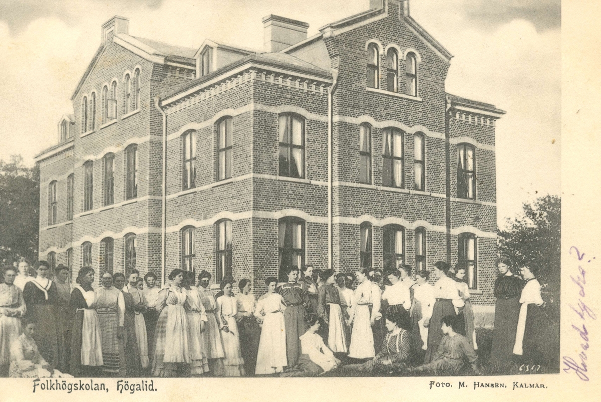 Vykort föreställande Högalids folkhögskola i Smedby, med personal och elever framför skolbyggnaden. Märk att på bilden finns endast kvinnor.