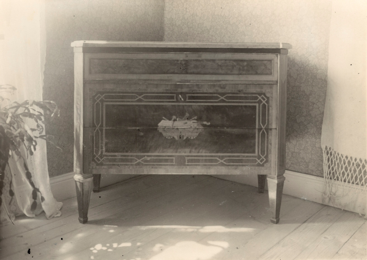 Gustaviansk byrå. I den övre låga lådan har det funnits rutformigt lagda beslag. I mittgruppen en musiktrofé på konsol. Överst en grå marmorskiva.