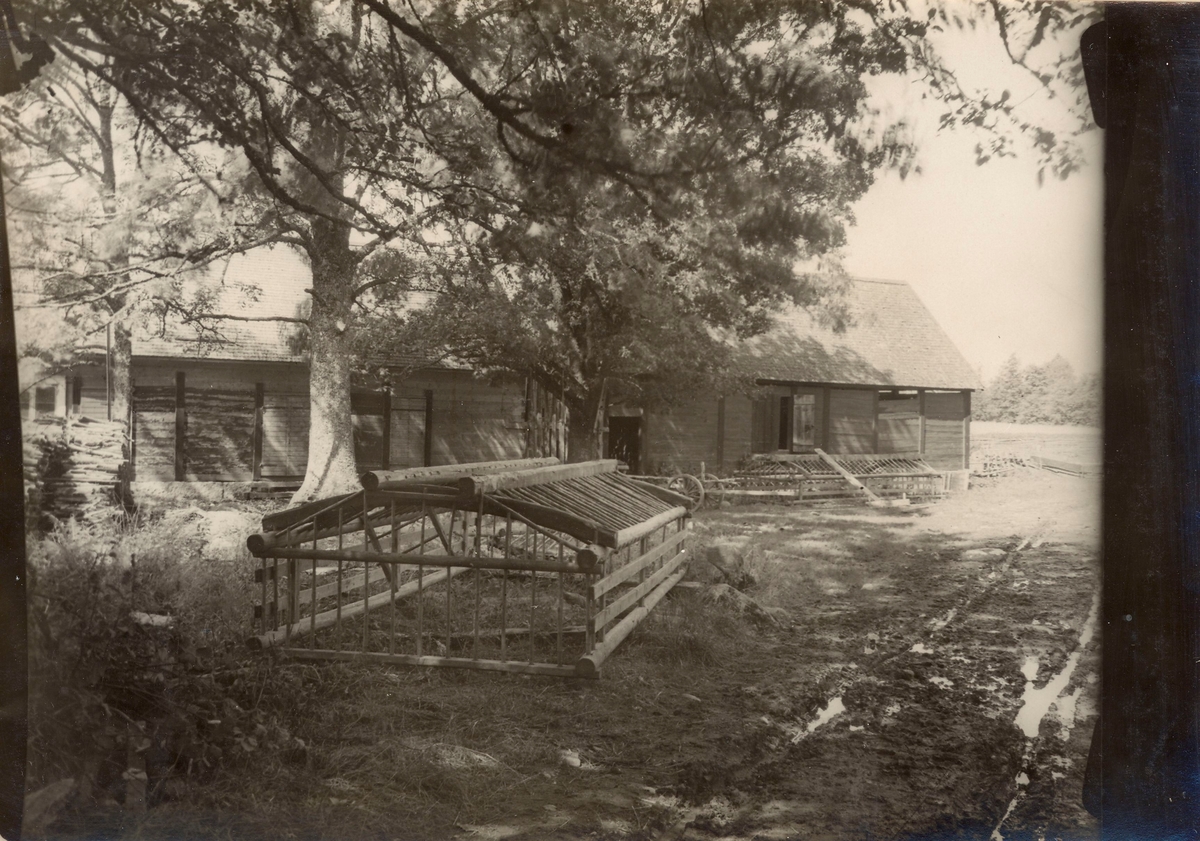 Före detta prästgårdens ladugård, skiftesverkslängor under spåntak. Röda väggar med svarta stolpar. Låg vid nuvarande golfbanan i Vissefjärda.