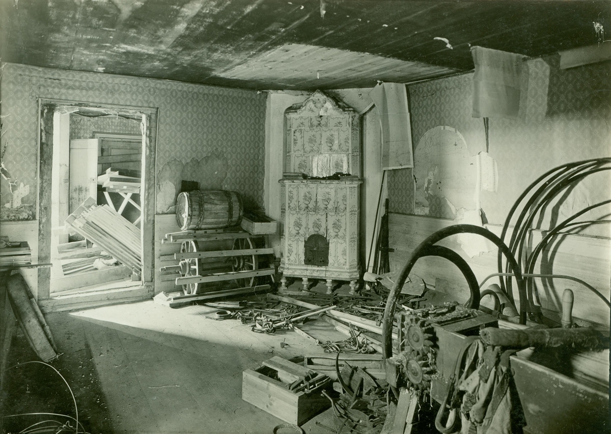 Huvudbyggningen: salen bakom förstugan. Kakelugn från 1700-talet mitt. Sena tapeter, därunder vägg målad i en ton.