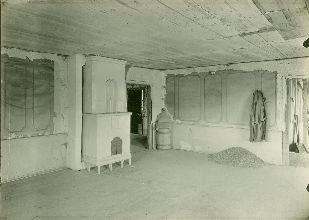 Huvudbyggningen: salen t.v. av förstugan. Gustaviansk väggdekor på papp. Gul kakelugn från 1700- talets slut.