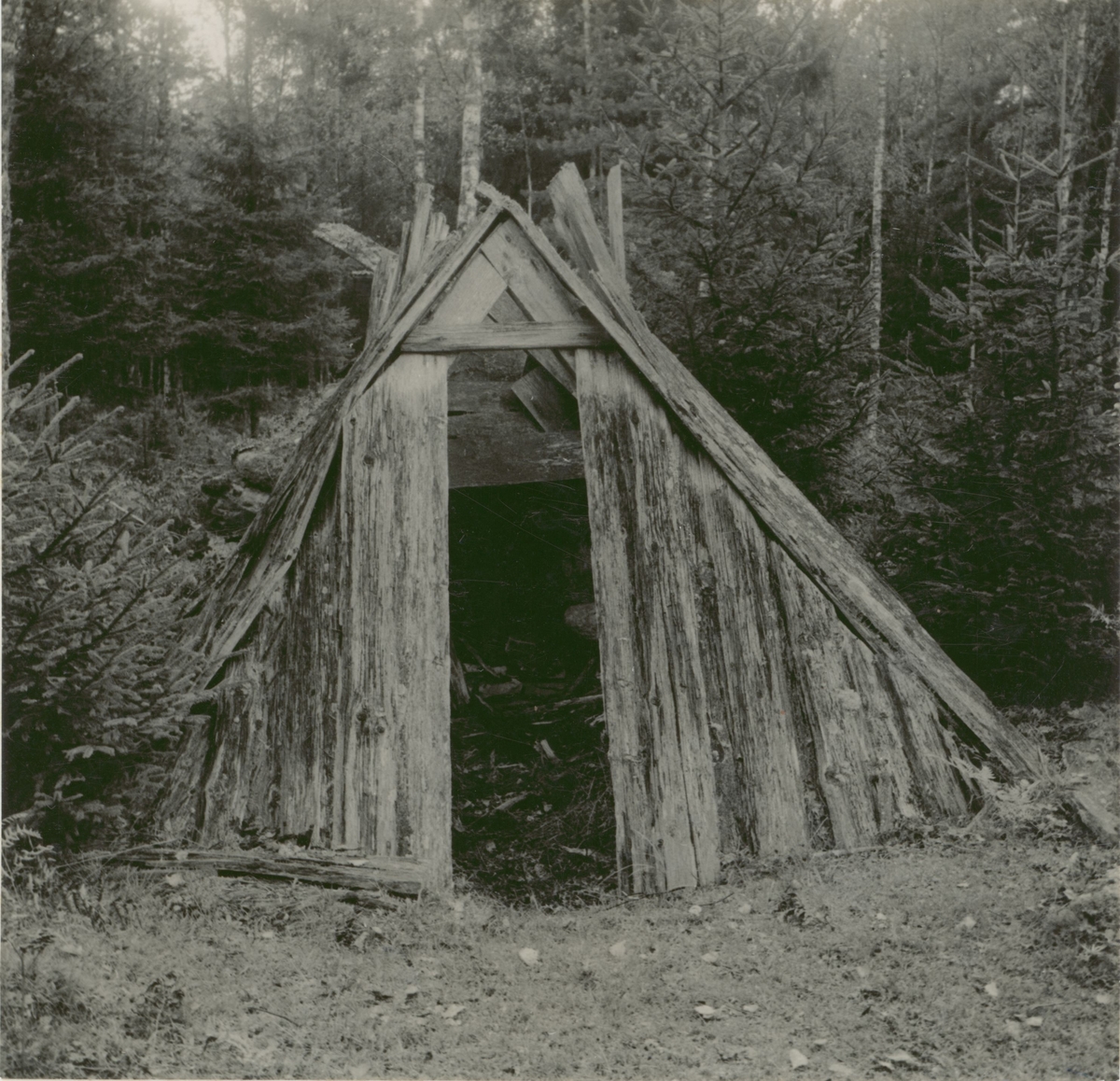 Kolhytta med spis, nu i ruiner. Dörren lyftes för. I hyttan bäddades med granris.