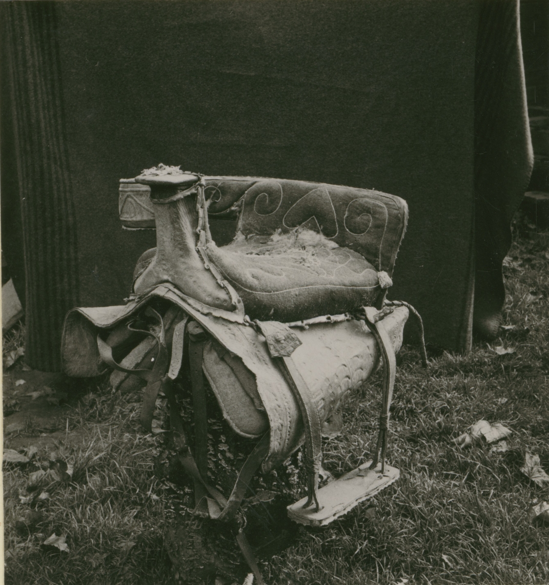 Sadeln är daterad anno 1824 B C D S D inom en rankdekor runt karmen. Instämplad dekor å lädret. Ranka, tulpaner och hjärtan sytt i kedjestygn på det blå ylletyget som sitsen är klädd med.
