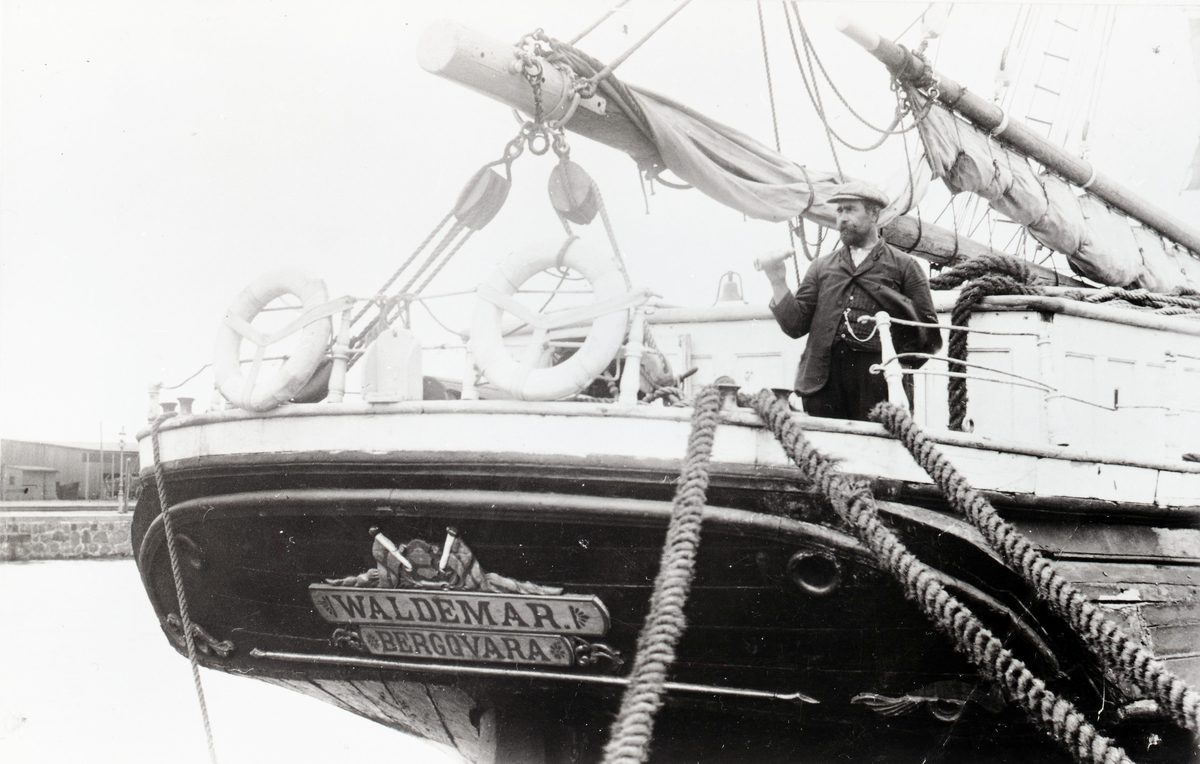 Waldemar av Bergkvara. Kapten Engdal stående i aktern ombord på Waldemar, byggd 1877-78.