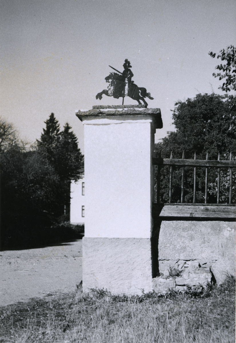 Portstolpar vid entren till mangården. Av kalksten, vitputsade. Ryttaren är utskuren i järnplåt och svartmålad.