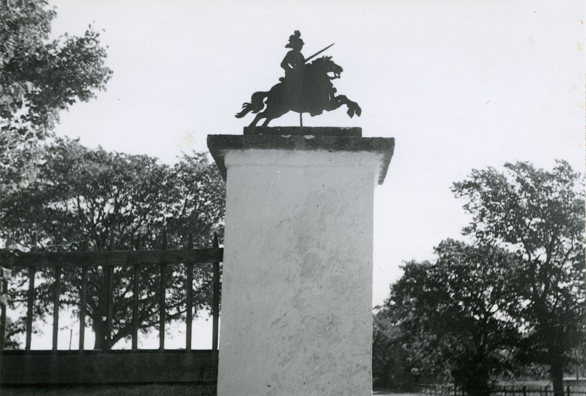 Portstolpe vid entren till mangården. Av kalksten, vitputsad. Ryttaren utskuren i järnplåt och svartmålad.