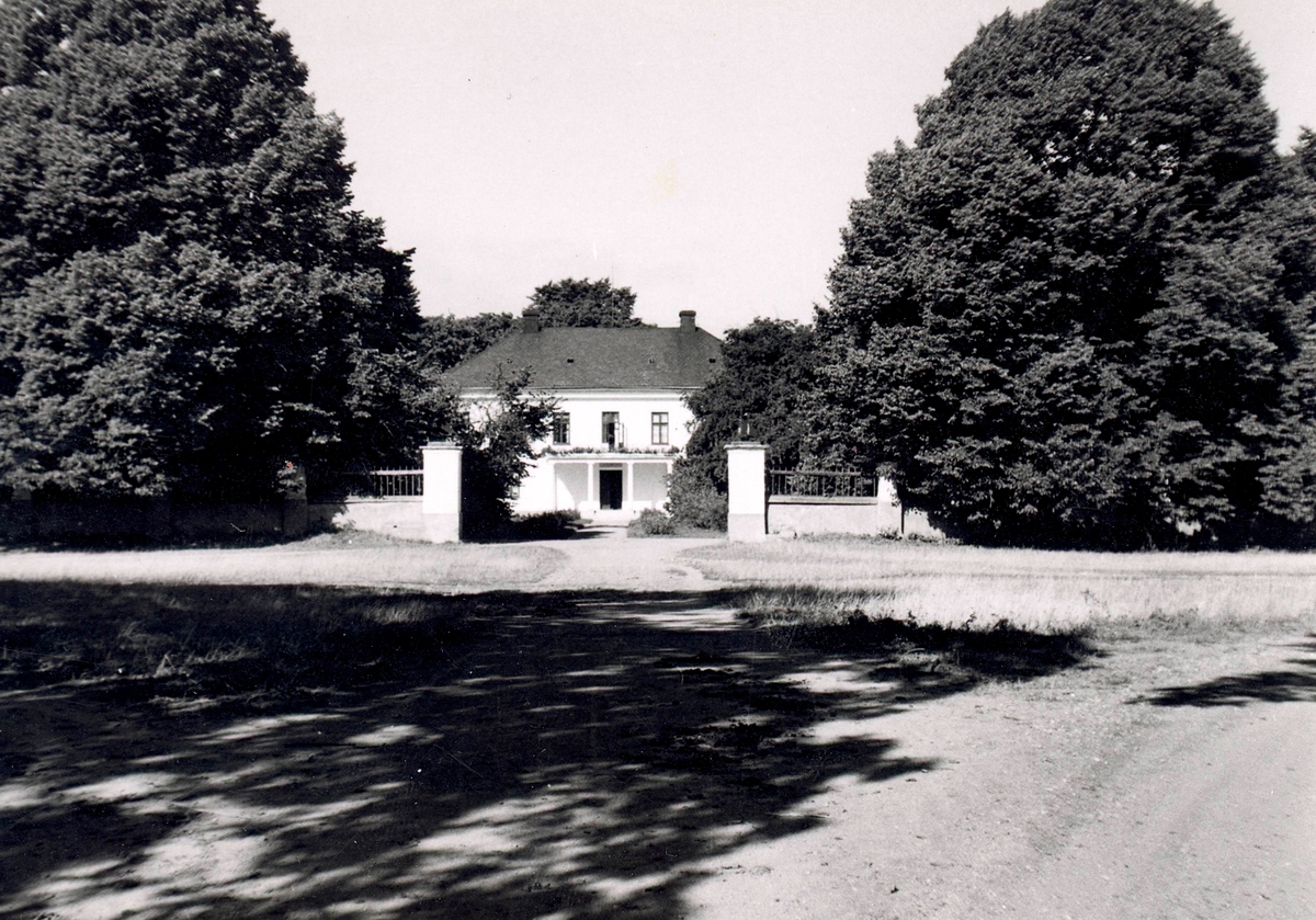 Huvudbyggnaden från stora uppfartsvägen. Staketet av murade stolpar och galler av trä på en murad sockel är till stösta del bevarad runt mangården.