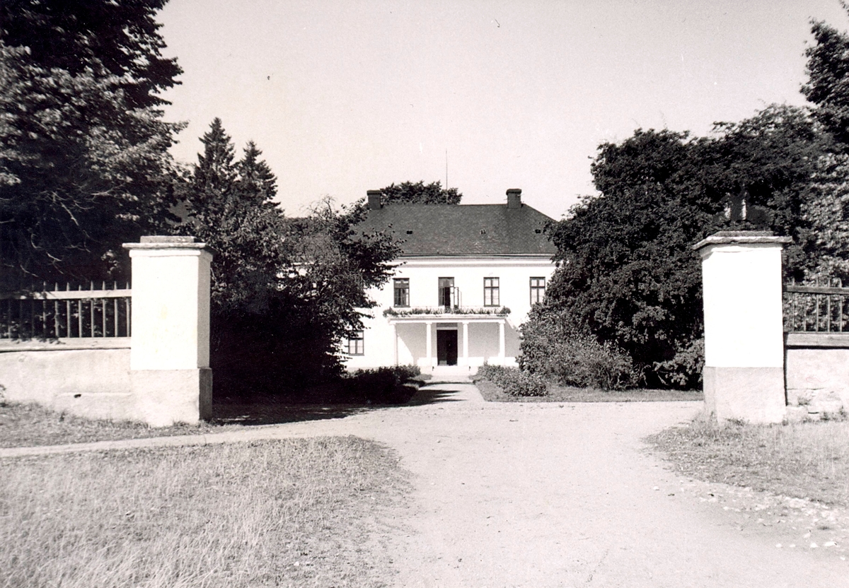 Huvudbyggnaden från stora uppfartsvägen. Staketet av murade stolpar och galler av trä på en murad sockel är till stösta del bevarad runt mangården.