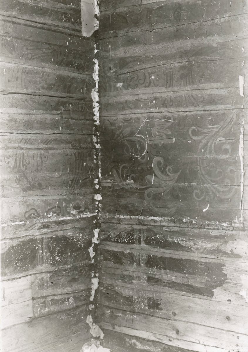 Målning på timret upptäckt vid reparationsarbete i Dahmska huset 1941. Nedre våningen, hörnrummet. Fragment från rummets hörn mot S. Långgatan o. V. Sjögatan. Se uppmätning, akvarellavbildning och färgprov 1941.
