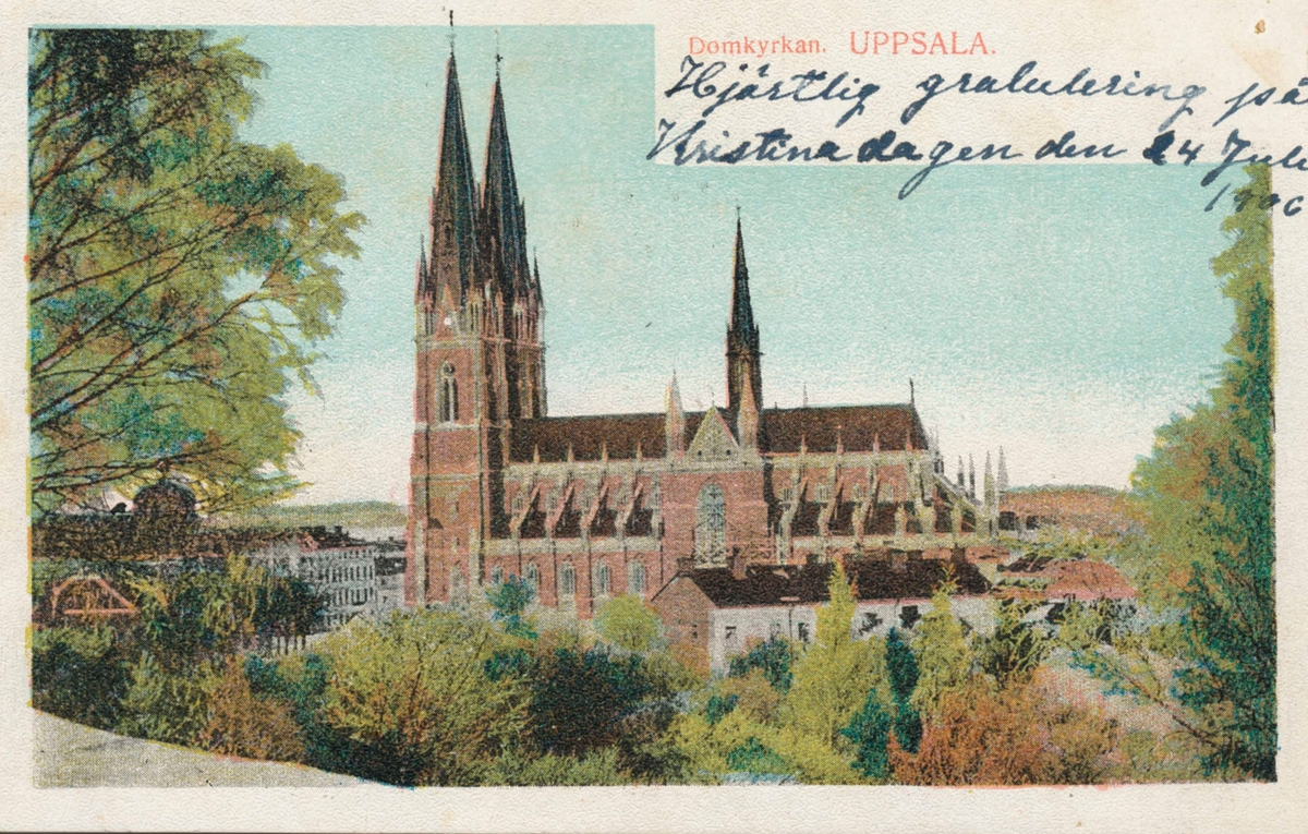 Vykort till Kristina Andersson, född 1865 i Böda, syster till N J Andersson. Längst upp i högra hörnet står skrivet "Hjärtlig gratulation på Kristinadagen den 24 juli 1906."