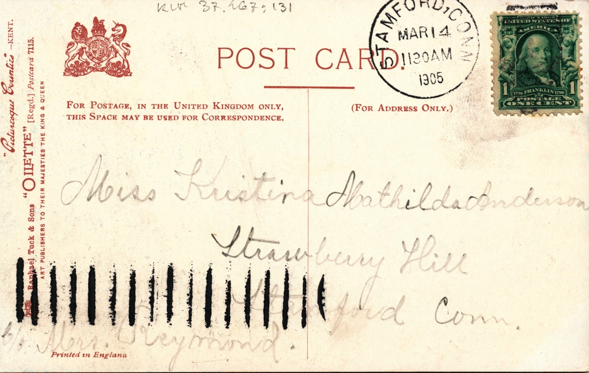 Ett vykort till Kristina Mathilda Andersson, Strawberry Hill, Stamford, Connecticut från Frida.