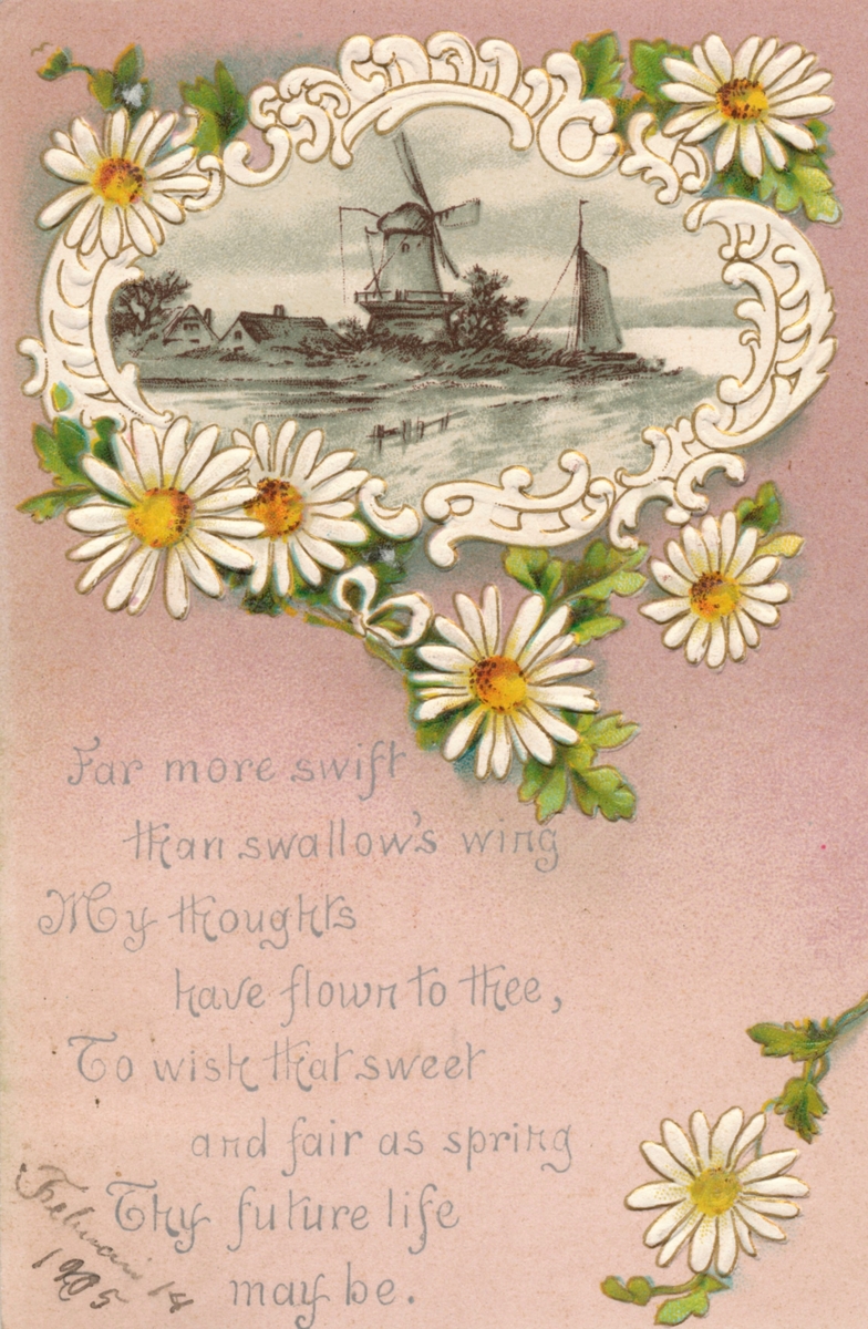 Vykort till Kristina Andersson, född 1865 i Böda, syster till N J Andersson, när hon bodde i USA från vänner i USA. Nedtill står tryckt: "Far more swift than swallow´s wing My thoughts have flown to T hee, to wish that sweet and fair as spring Thy future life may be. February 14, 1905."