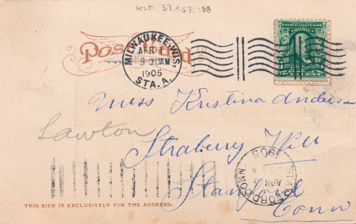 Ett vykort till Miss Kristina Andersson, Strawberry Hill, Stamford Conn från Gärda. Kortet är stämplat 1905.