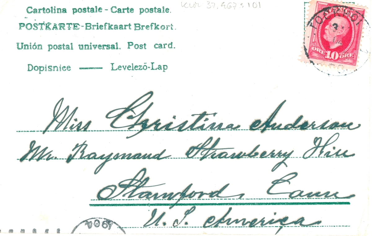 Ett vykort till Kristina Anderson, Stamford, Connecticut, USA. Det är skrivet av Edvard Nilsson i Böda.
