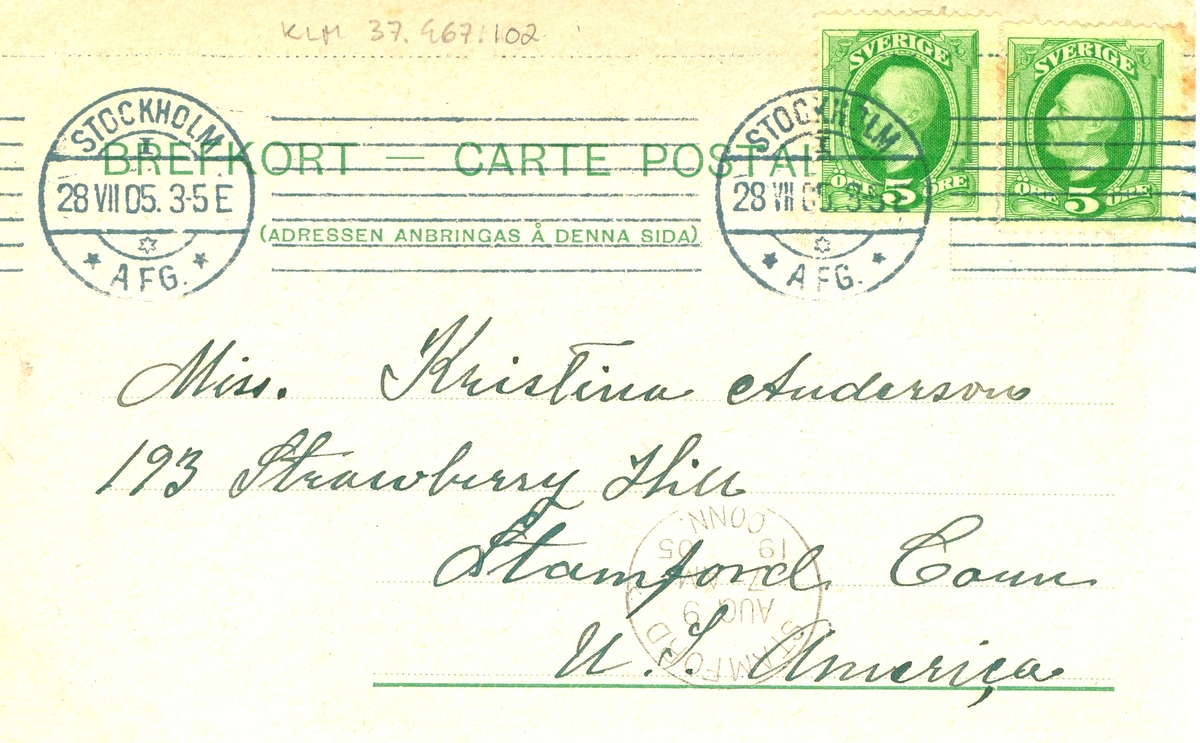 Ett vykort till Kristina Anderson, Stamford, Connecticut, USA. Det är skrivet av Edvard Nilsson i Böda.