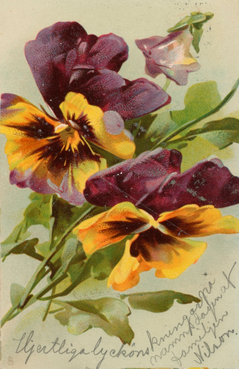 Vykort till Kristina Andersson, född 1865 i Böda, syster till N J Andersson, när hon bodde i USA från vänner i USA. På kortet står skrivet "Hjertliga lyckönskningar på namnsdagen af familjen Nilsson."