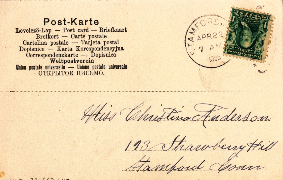 Ett vykort till Christina Andersson, 193, Strawberry Hill, Stamford, Conn. [Connecticut].
