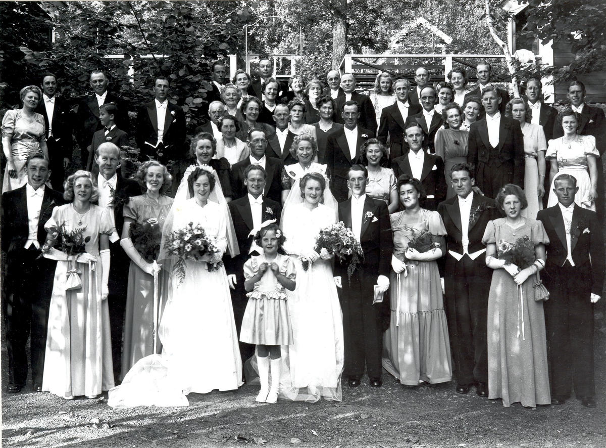 Dubbelbröllop i Misterhults kyrka den 23 juni 1948. Brudarna är systrar. Fotot taget på Basarkullen i Mörtfors.