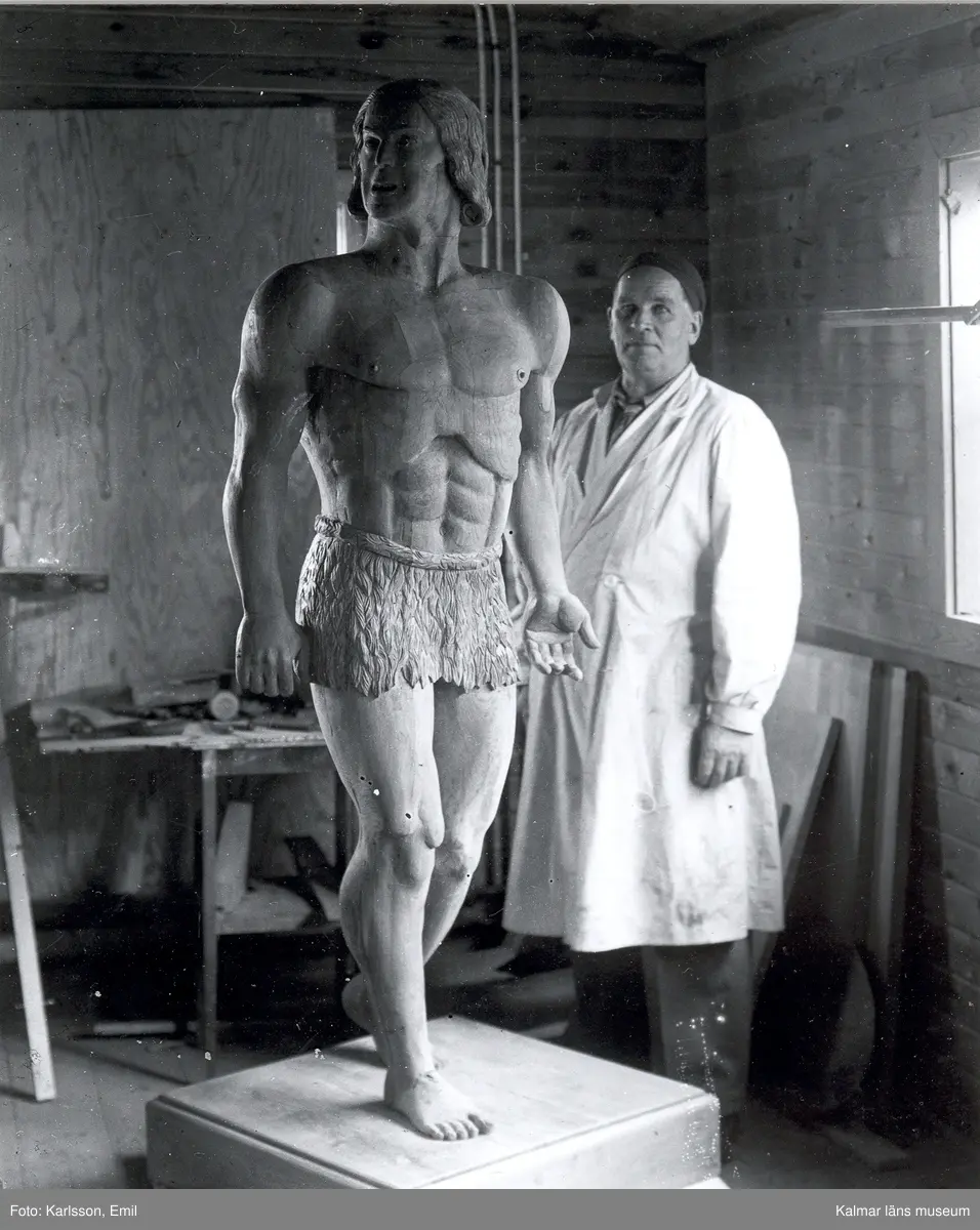 Konstnären och skulptören Otto Jansson, Mörtfors med skulpturen "Tarzan". Modell till skulpturen var Hardy Ahrland, Stockholm. Bilden tagen i möbelfabrikens lokaler.