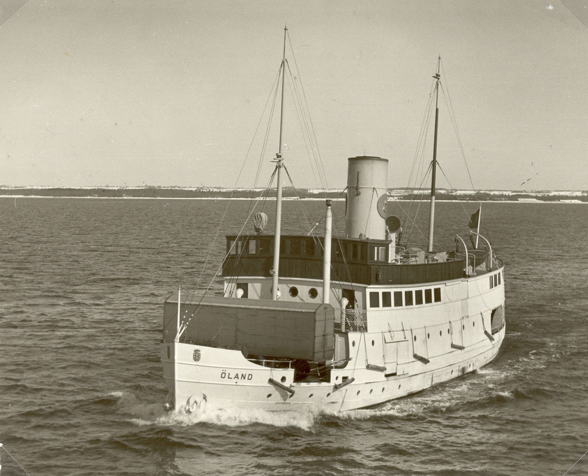 Postångaren Öland med en godsvagn tvärs på fördäck.