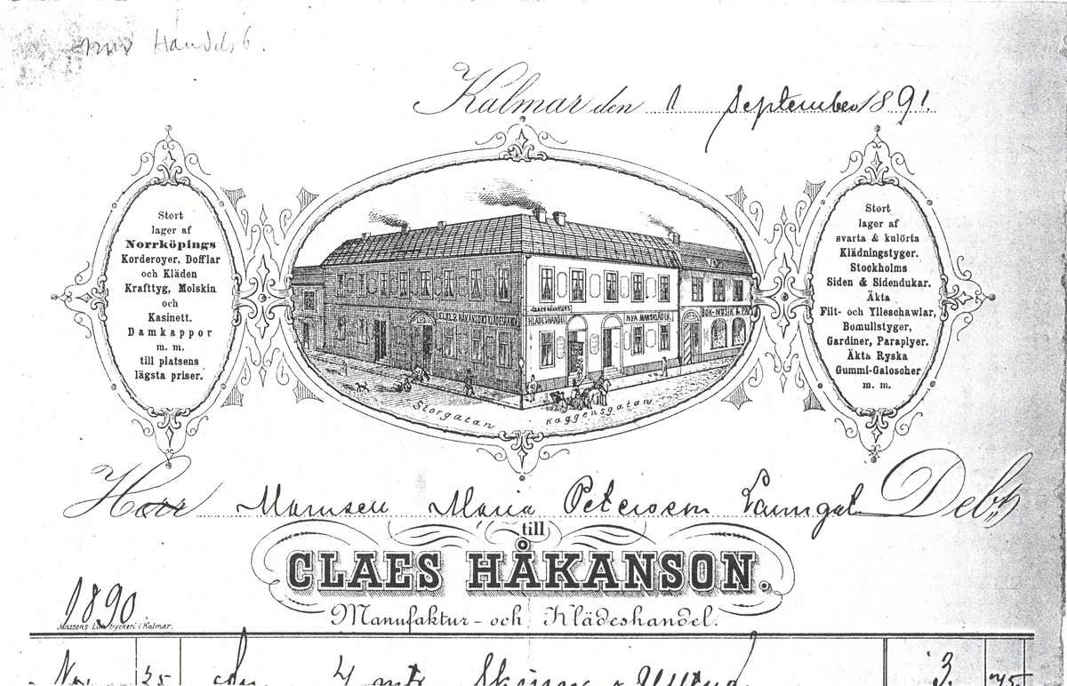 Bilden visar en följesedel från Håkanssons manufaktur- och klädeshandel.