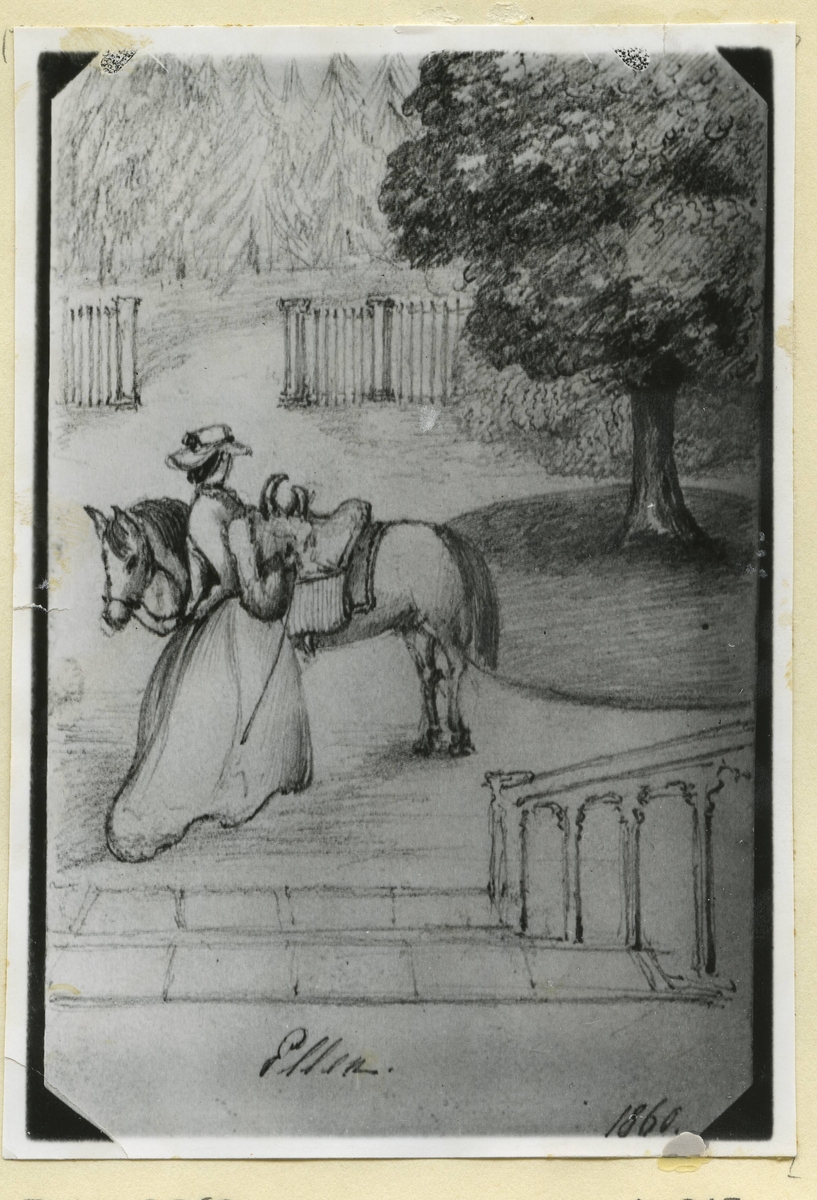 Teckning av Ulla Toll i skissbok, tillhörig fröken Alma Genberg 1932.