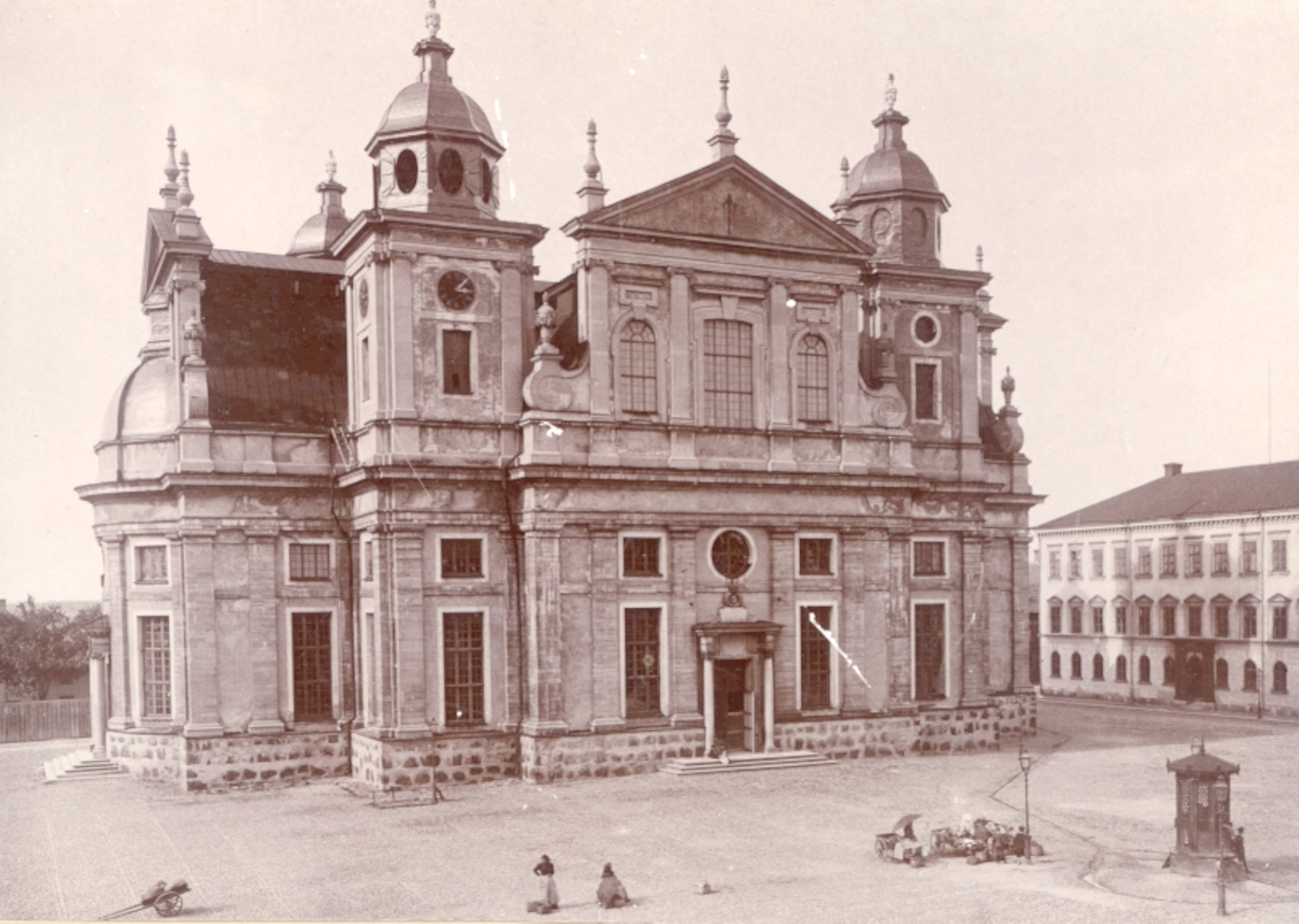 Kalmar domkyrka på Stortorget. Läroverket syns i bakgrunden till höger.