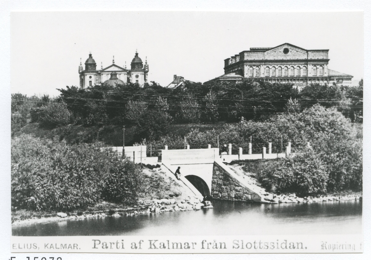 Parti af Kalmar från Slottsidan. Man ser den nybyggda, ännu oputsade teatern och Domkyrkan.
