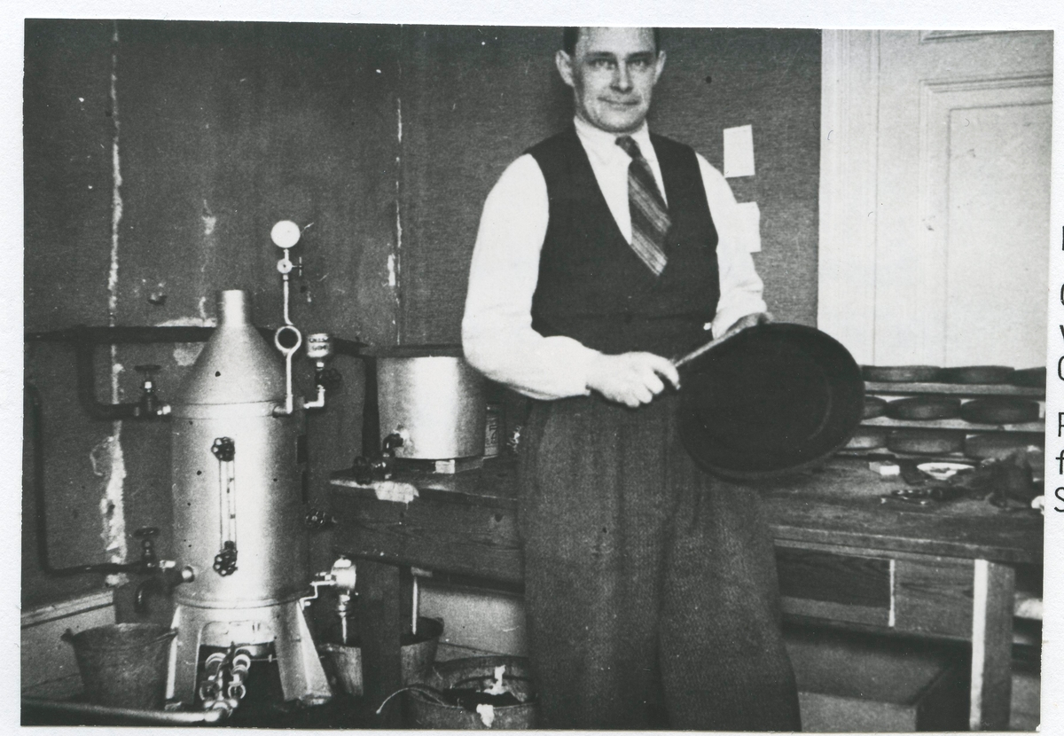 Hattkompaniet. Gustav Johansson (1903-1960), ägare av Hattkompaniet i arbete i verkstaden på N Långgatan 9, ca 1937.