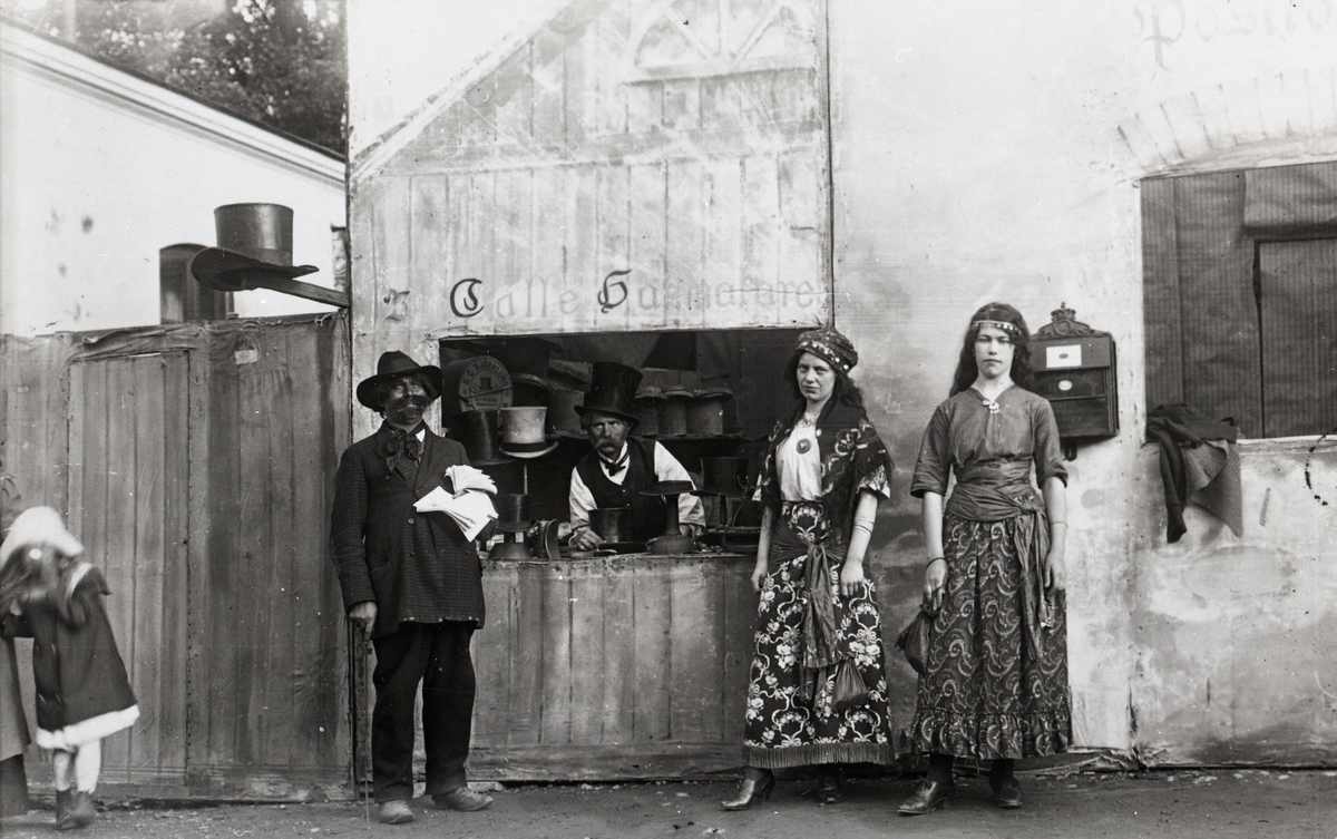 Utklädda människor vid ett hattmakeri under hantverksmässan som anordnades av Kalmar Fabriks- och Hantverksförening.