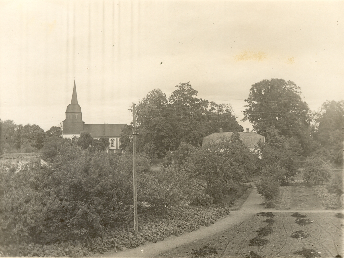 Parti från trädgården vid Tuna gård med kyrkan och en av flyglarna i lunden.