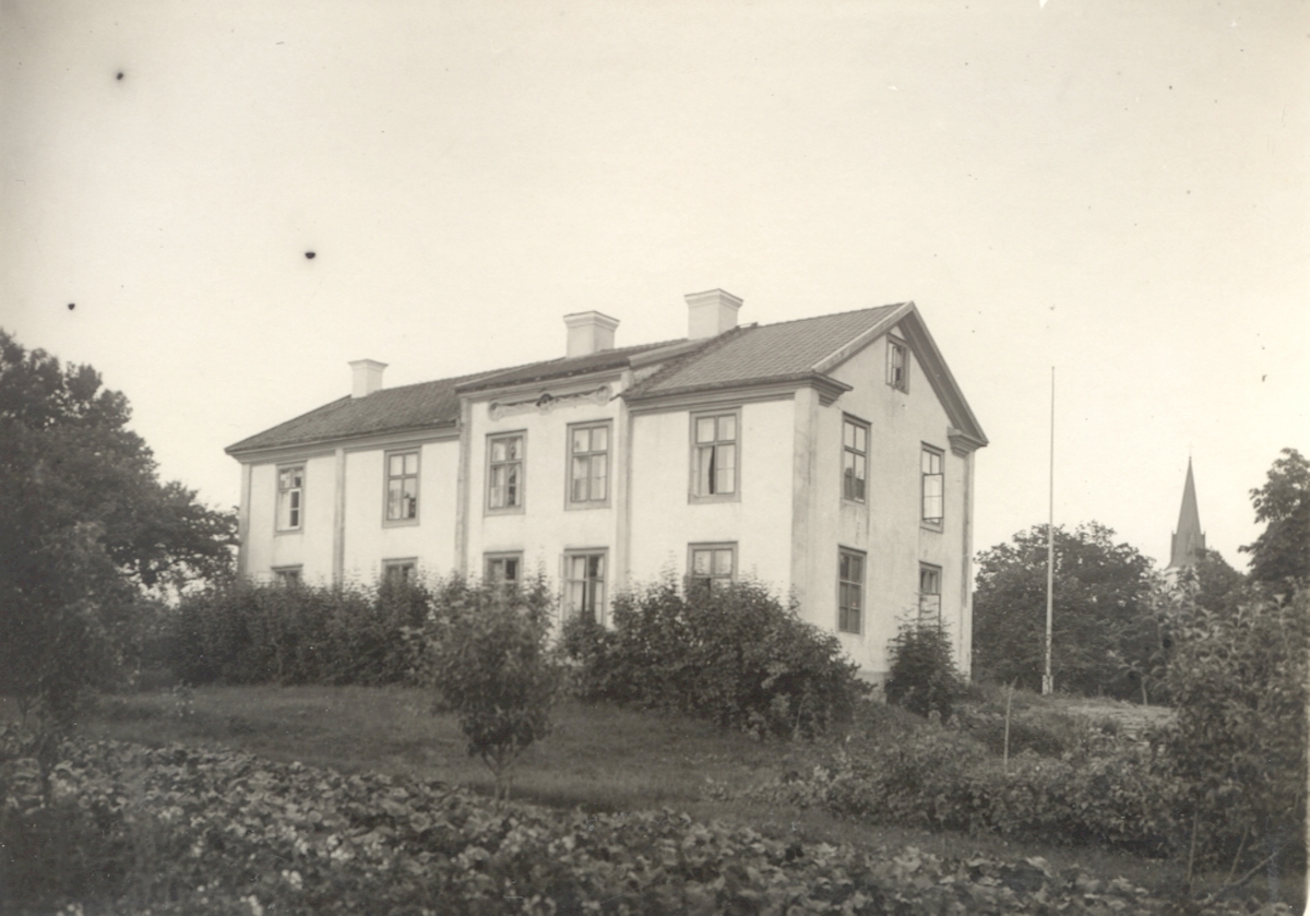 Fagerhults herrgård sedd från trädgården. Den är uppförs i timmer ,och är vitputsad.. En äldre byggnad i en våning är tillbyggd av Rosander i mitten på 1800-talet.